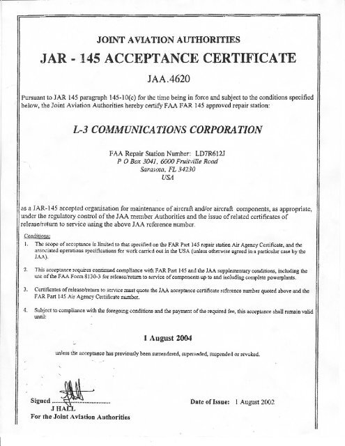 J AR - 145 ACCEPTANCE CERTIFICATE - L-3 Aviation Recorders